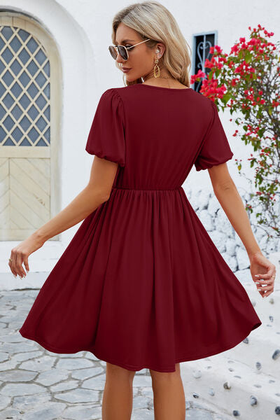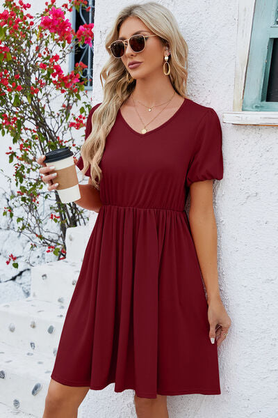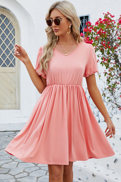 V-Neck Balloon Short Sleeve Dress